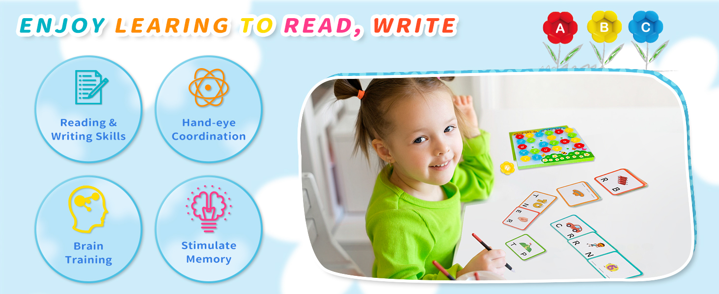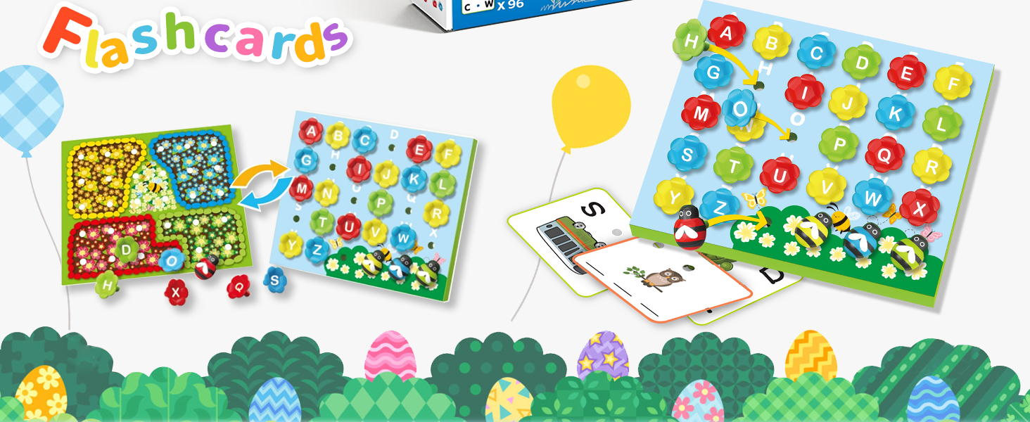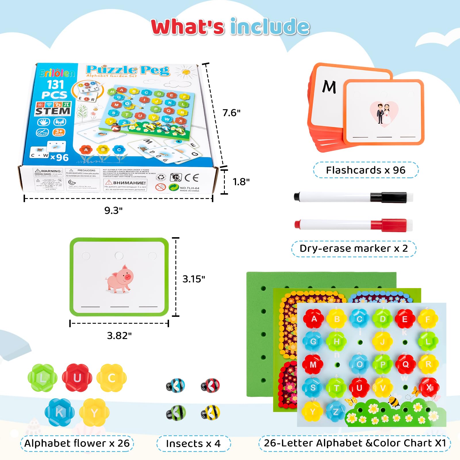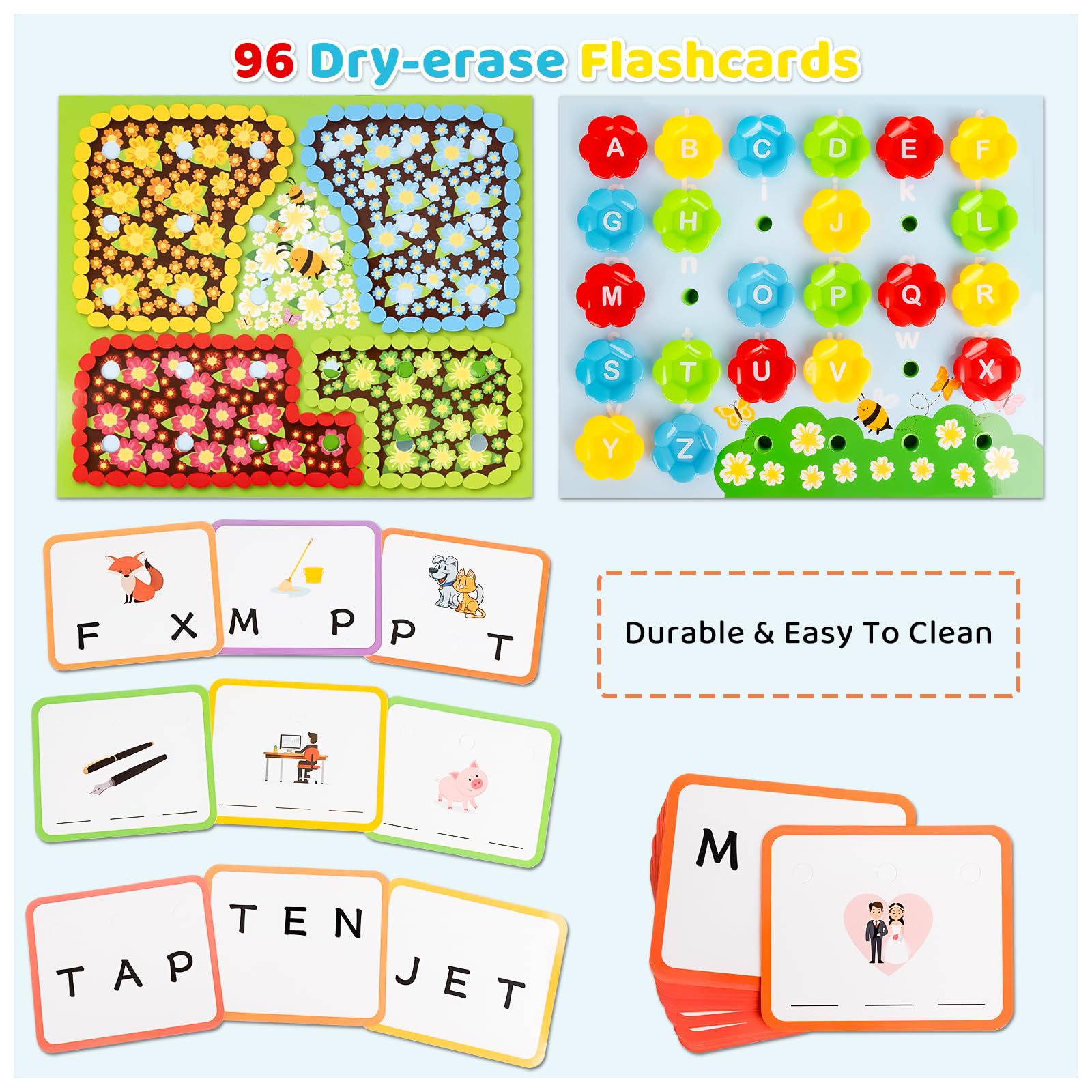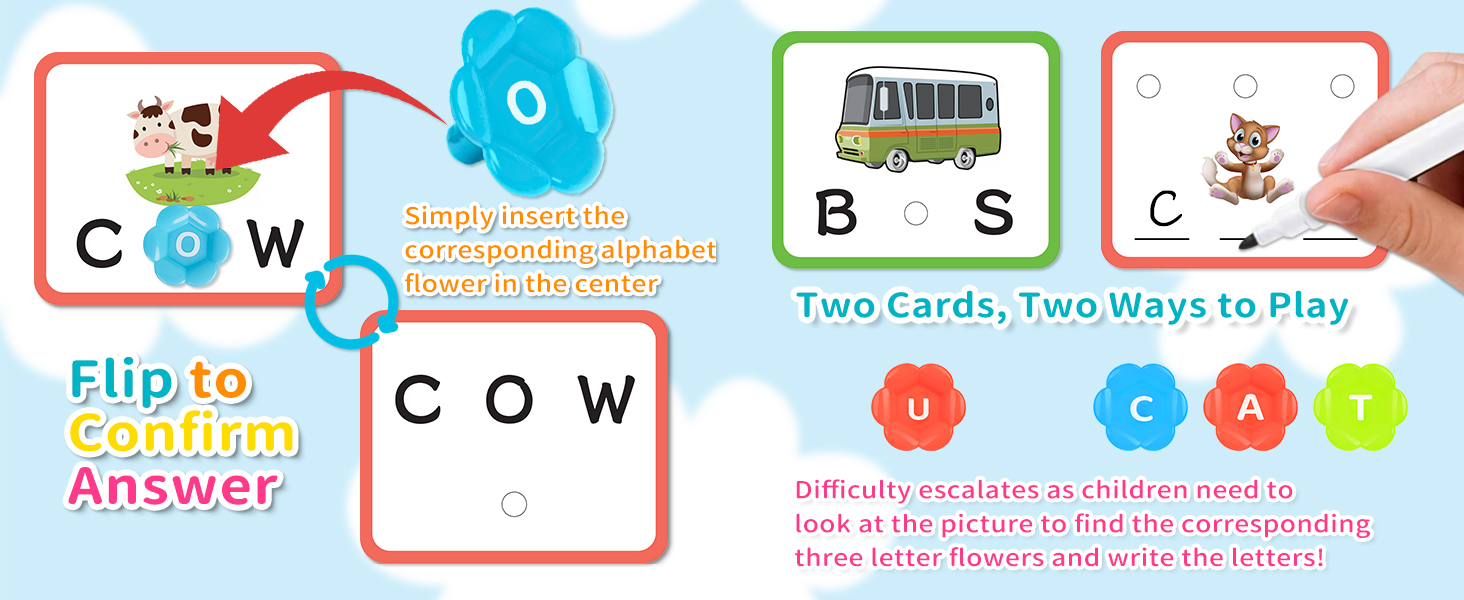 🎊【CVC Spelling Flash Cards Set】 Package includes 96 x CVC Sight Words Flashcards, 26 x Alphabet Flowers, 1 x 26-Letter Alphabet, 1 x Color Chart, 4 x Insects, and 2 x Dry-erase Markers (1 blue and 1 red) which have the erasers on top.
